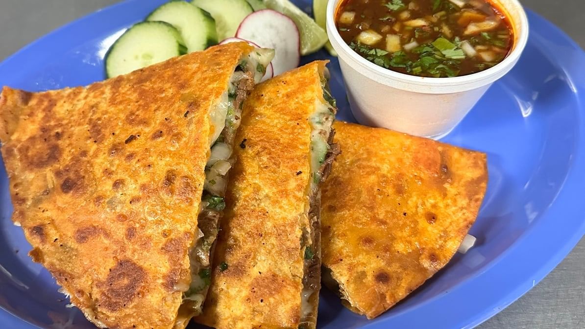 One fried flour tortilla stuffed with Monterey cheese &birria, deep-fried with birria oil. Topped with Monterey cheese, onions & cilantro. Served with consommé, rice and beans.