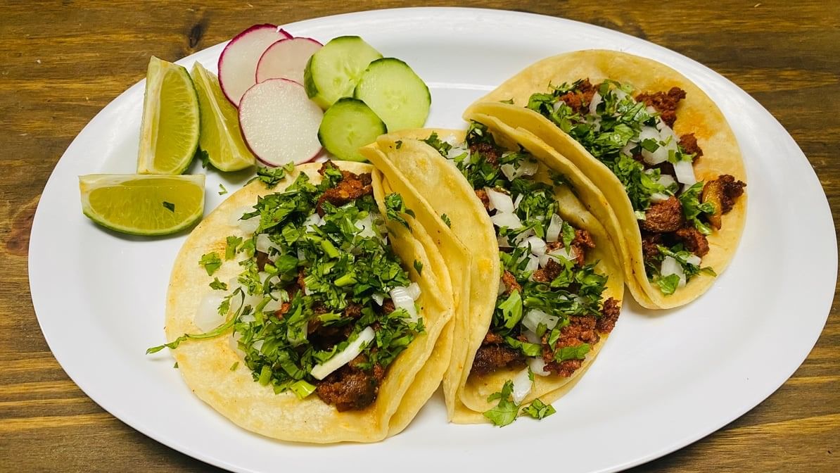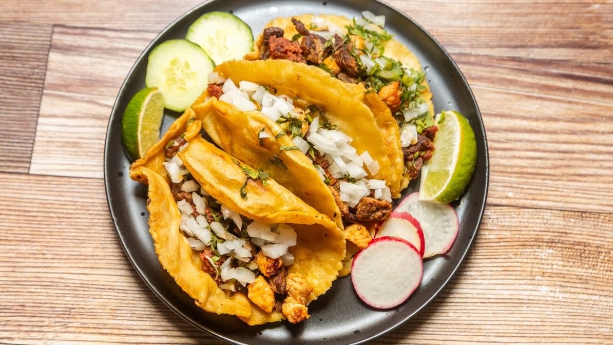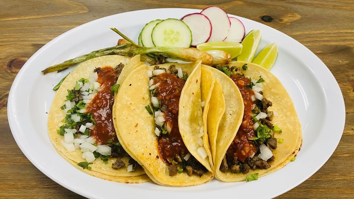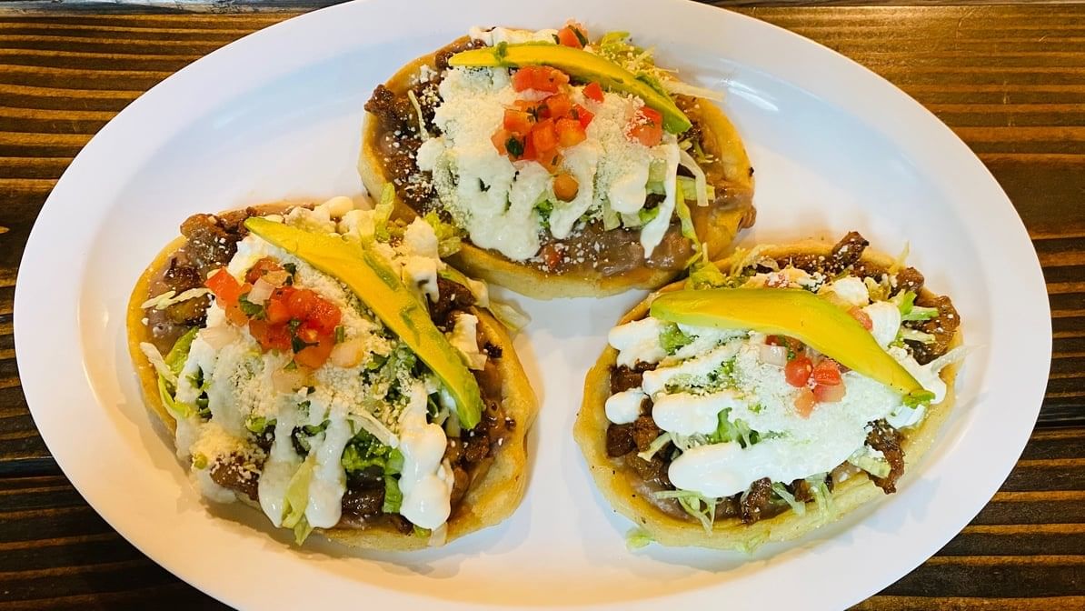 3 pcs. homemade corn tortilla. Topped with choice your meat, beans, lettuce, sour cream, cotija, Pico de Gallo & avocado.