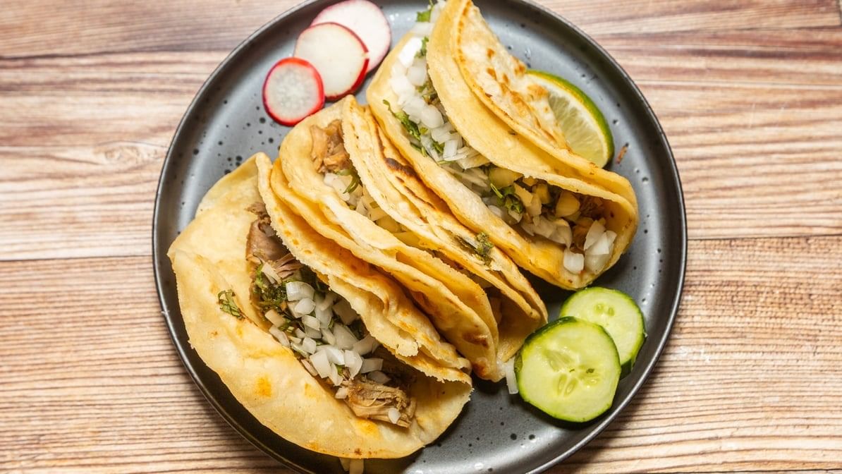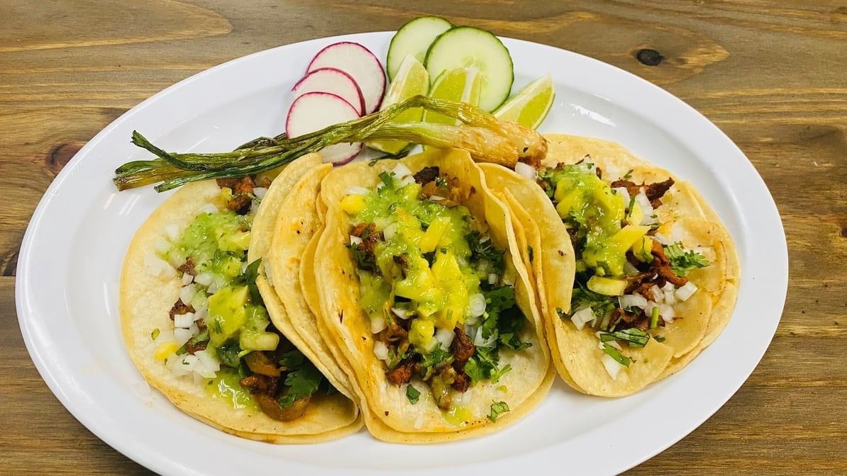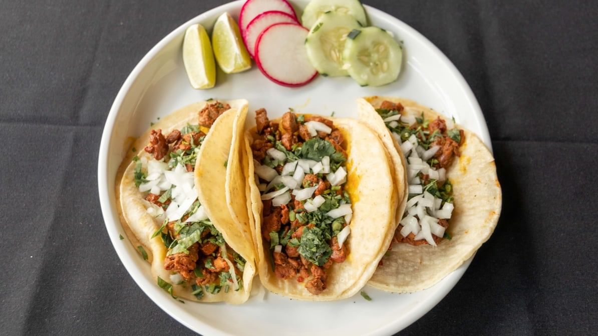 Its a traditional Mexican dish. It’s made by marinating pork in a citrusy, earthy mixture. Served with pickled red onions. 3 tacos per order; topped with cilantro & onions.