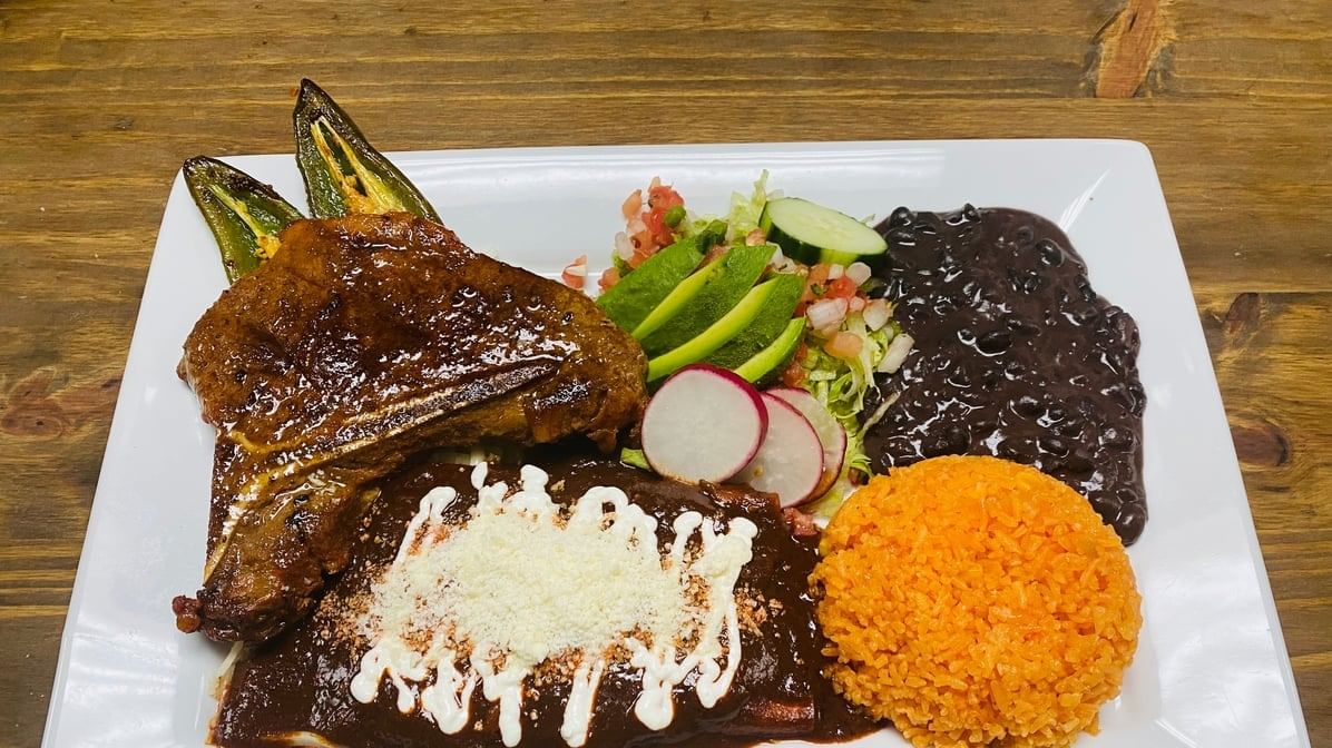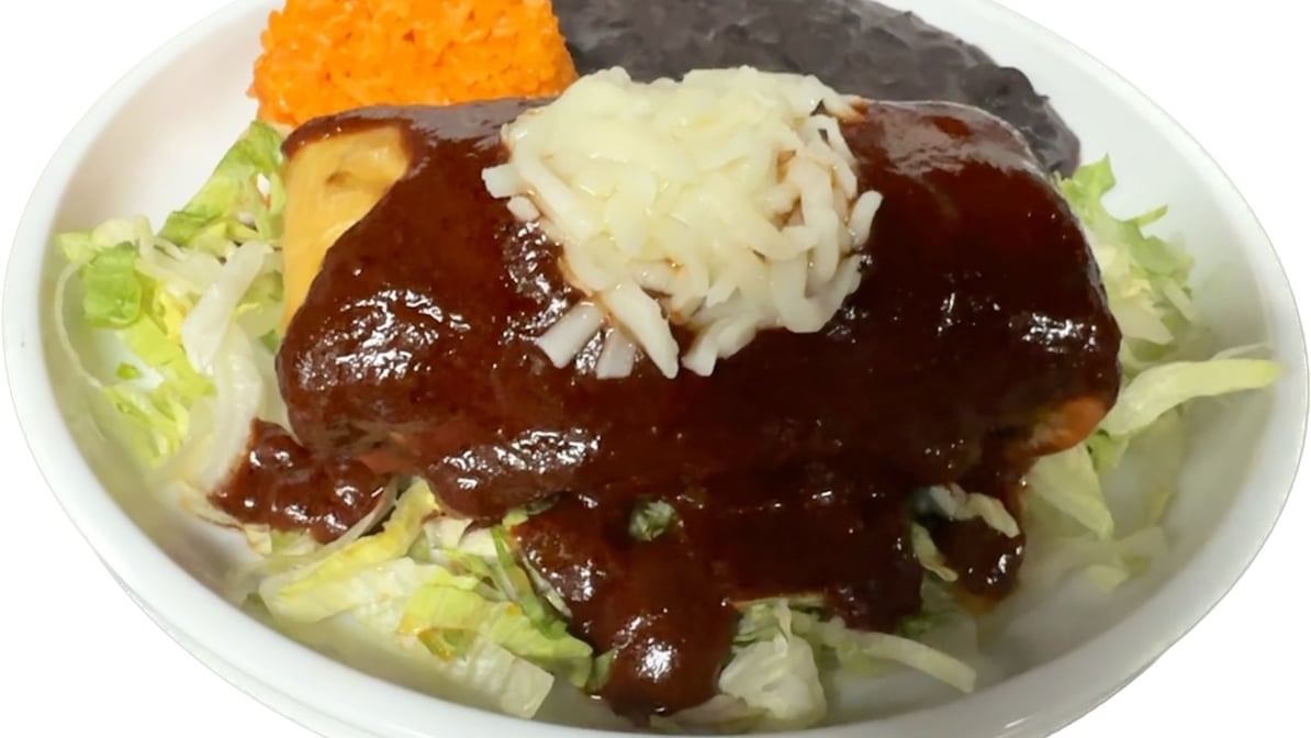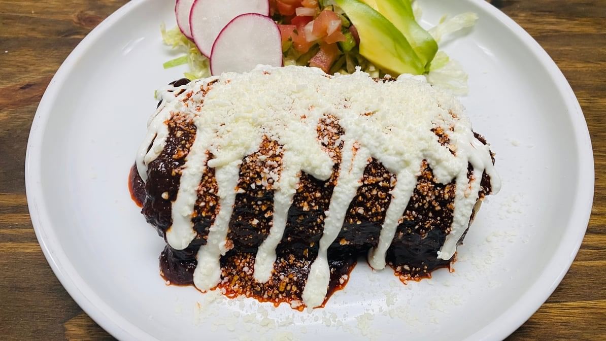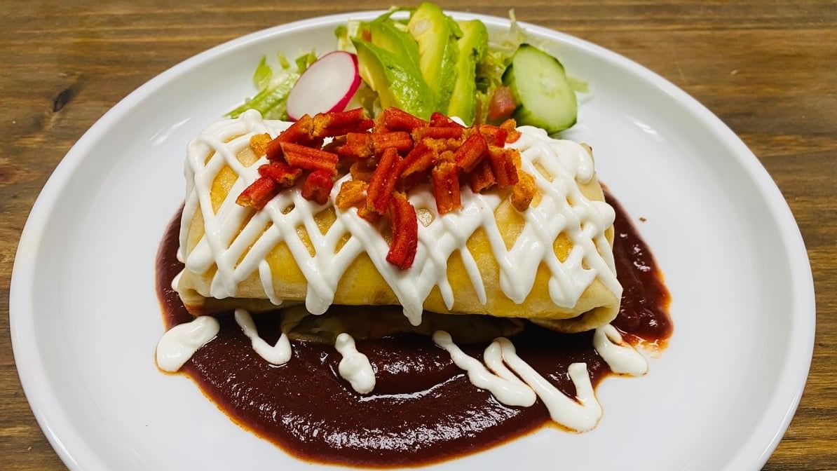 Rolled corn tortillas stuffed with plantains. Topped with mole salsa, lettuce, onions, sour cream, cotija cheese, red radish & avocado. Served w/ rice & beans