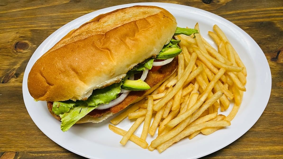 Breaded beef. Comes with refried beans, mayo, lettuce, onions, tomatoes, queso fresco, avocado & chipotle. Served with fries.