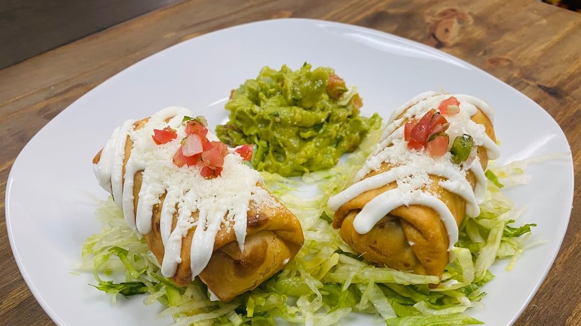 Two cheese mini chimichangas on lettuce, topped with sour cream & cotija cheese. Served w/ guacamole.