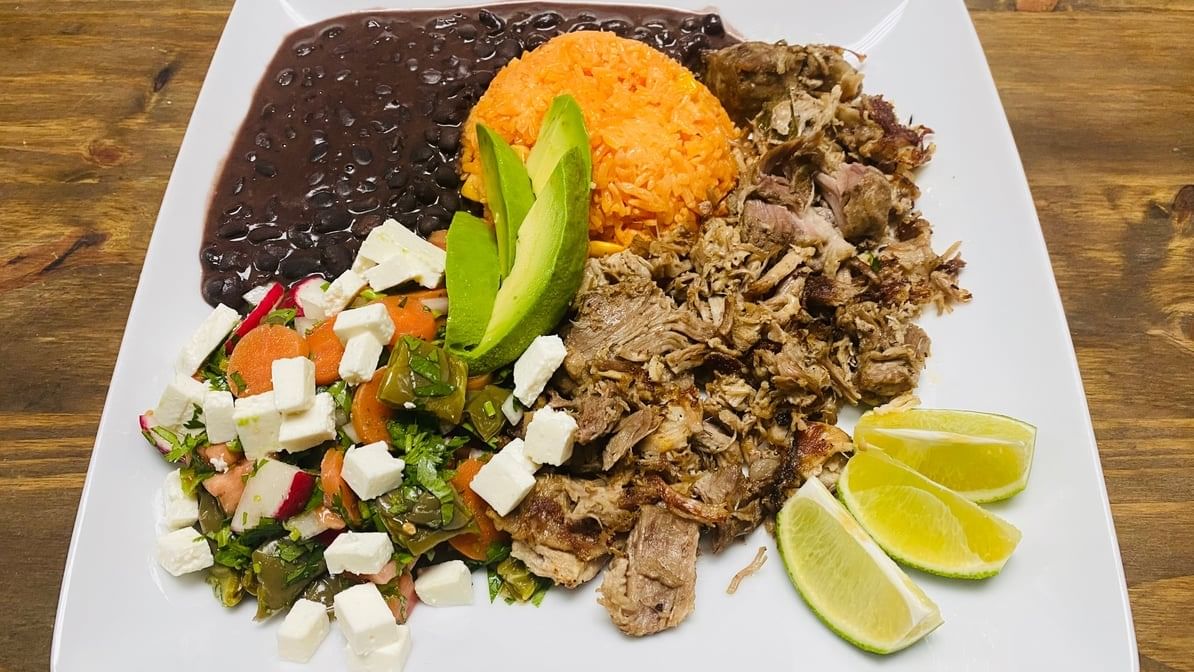 Juicy shredded pork shoulder with cactus salad & fresh guacamole. Served with salad, tortillas, rice & beans.