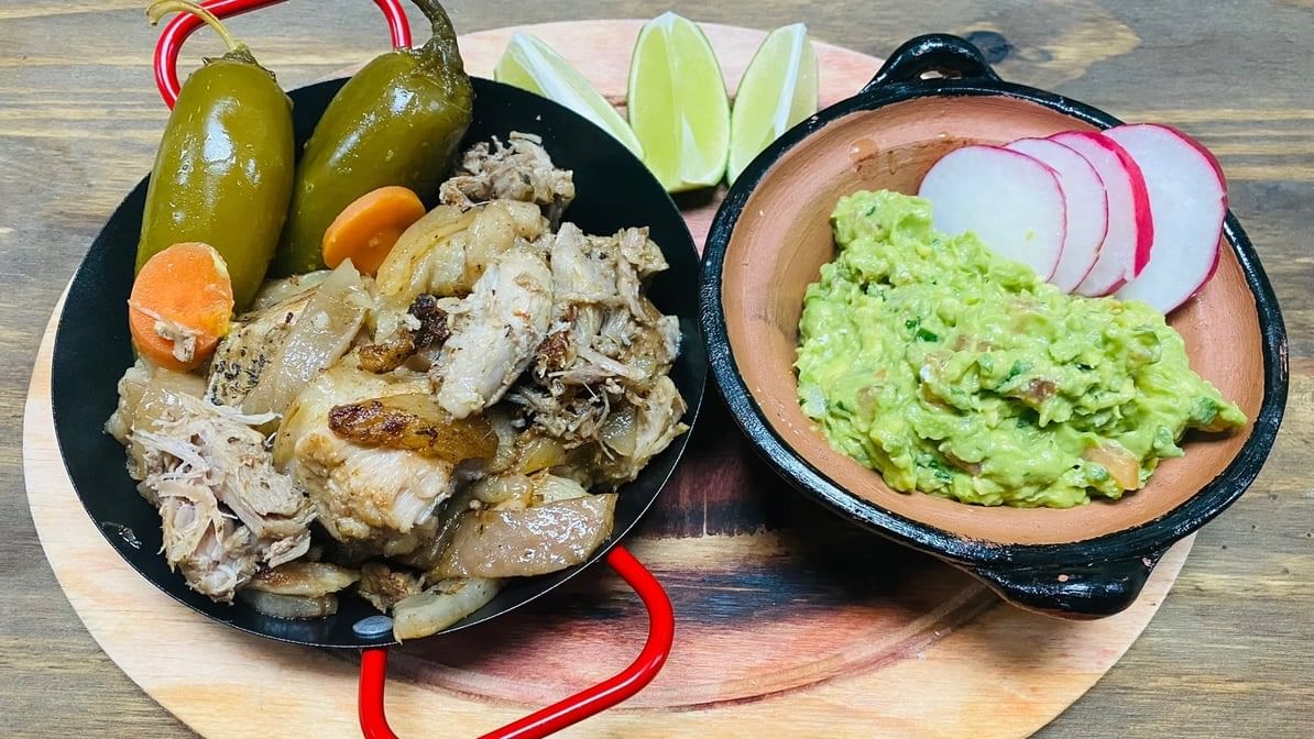 Is a traditional Mexican dish. It’s made by marinating pork in a citrusy, earthy mixture. Served with pickled red onions, beans & tortillas