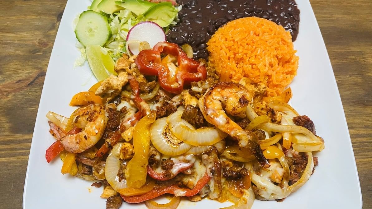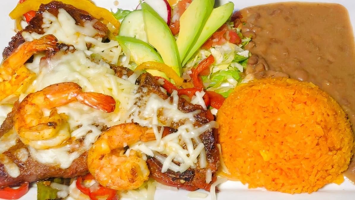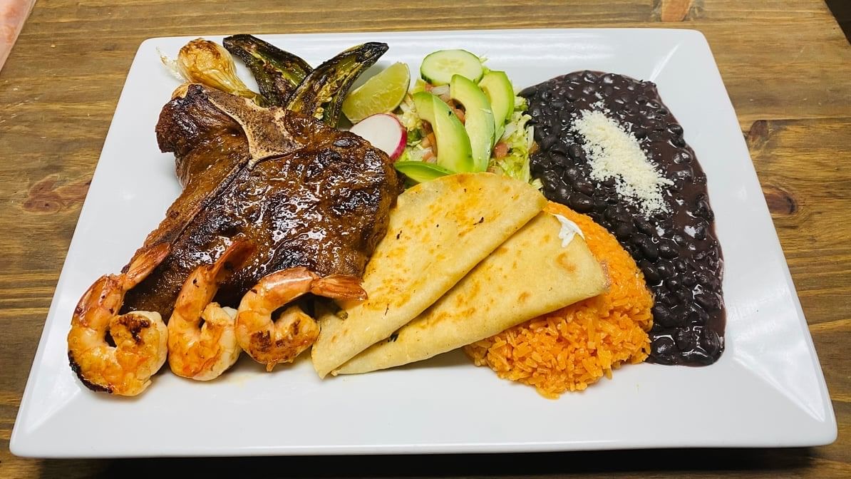 Porterhouse-steak, 3pcs grilled juicy shrimp, 2 pcs Oaxaca cheese quesadillas, onions, and grilled jalapeno. Served with salad, tortillas, rice & beans.