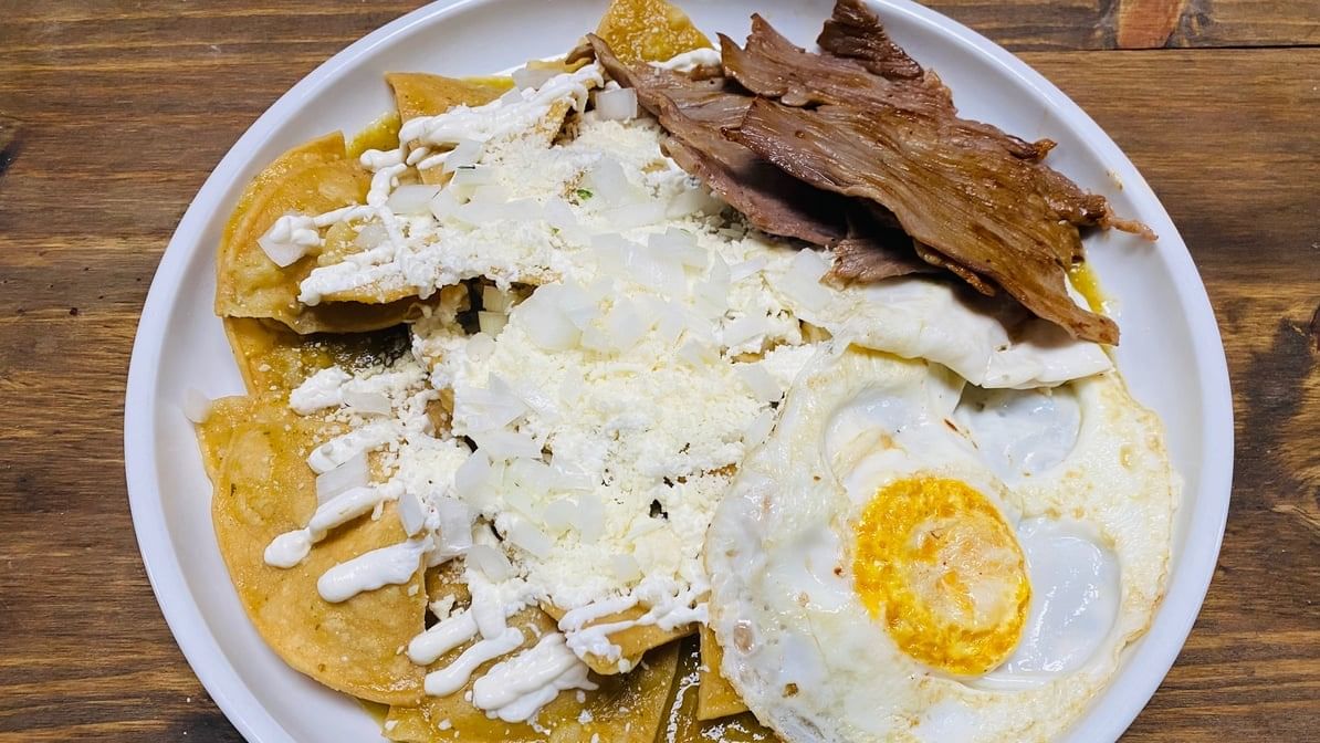 Choice of meat. (Cecina, chicken, or steak.) 3pcs corn tortillas dipped in ranchera or green salsa & pan-fried with diced onions & queso fresco.