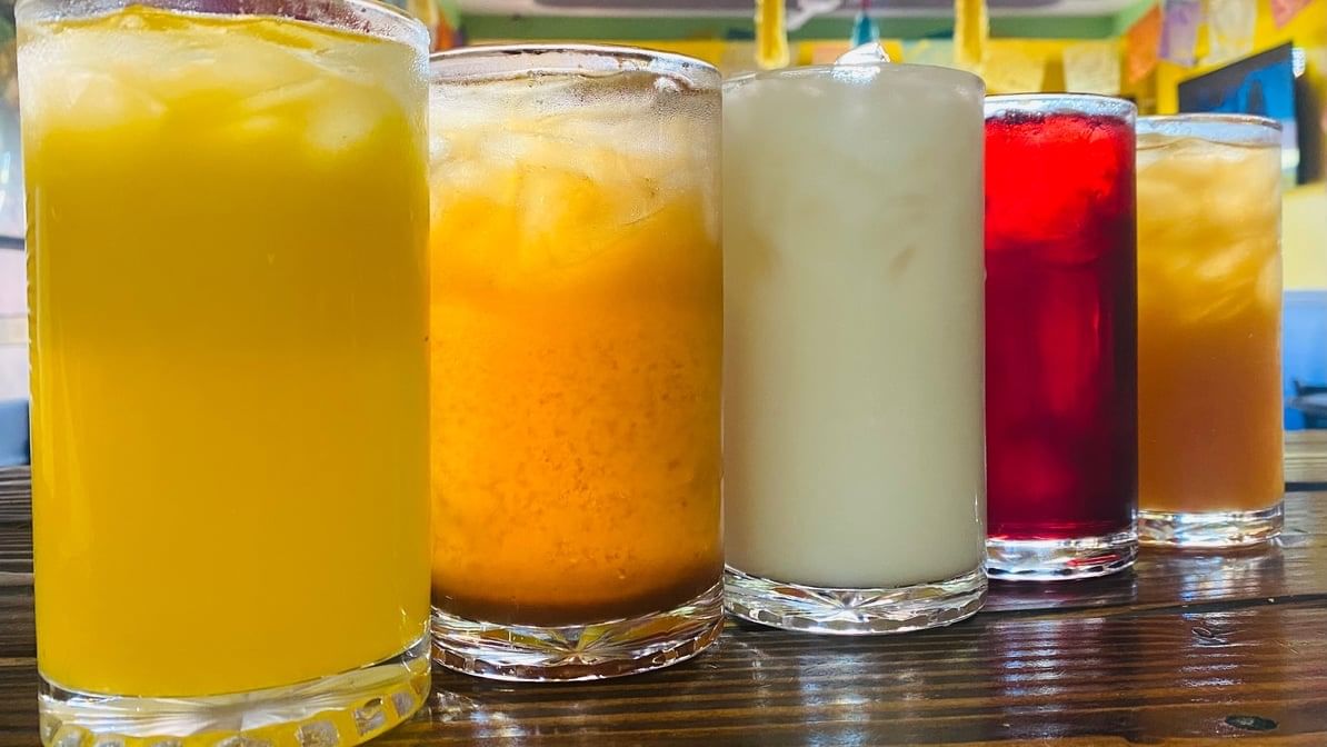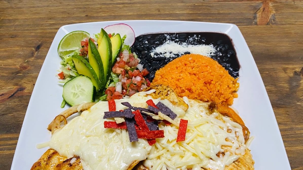 3 pcs. rolled corn tortillas. Stuffed with your meat, topped with your favorite sauce, green, ranchera, agave, suizas, mole, or orange hot salsa, lettuce, onions, sour cream, cotija & avocado. Served with rice and beans.