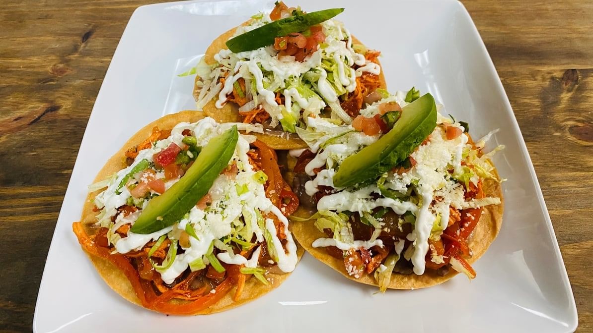 3pcs crispy fried corn tortilla, on a layer of beans. Choice of meat, topped with lettuce, sour cream, cotija, pico de gallo & avocado.