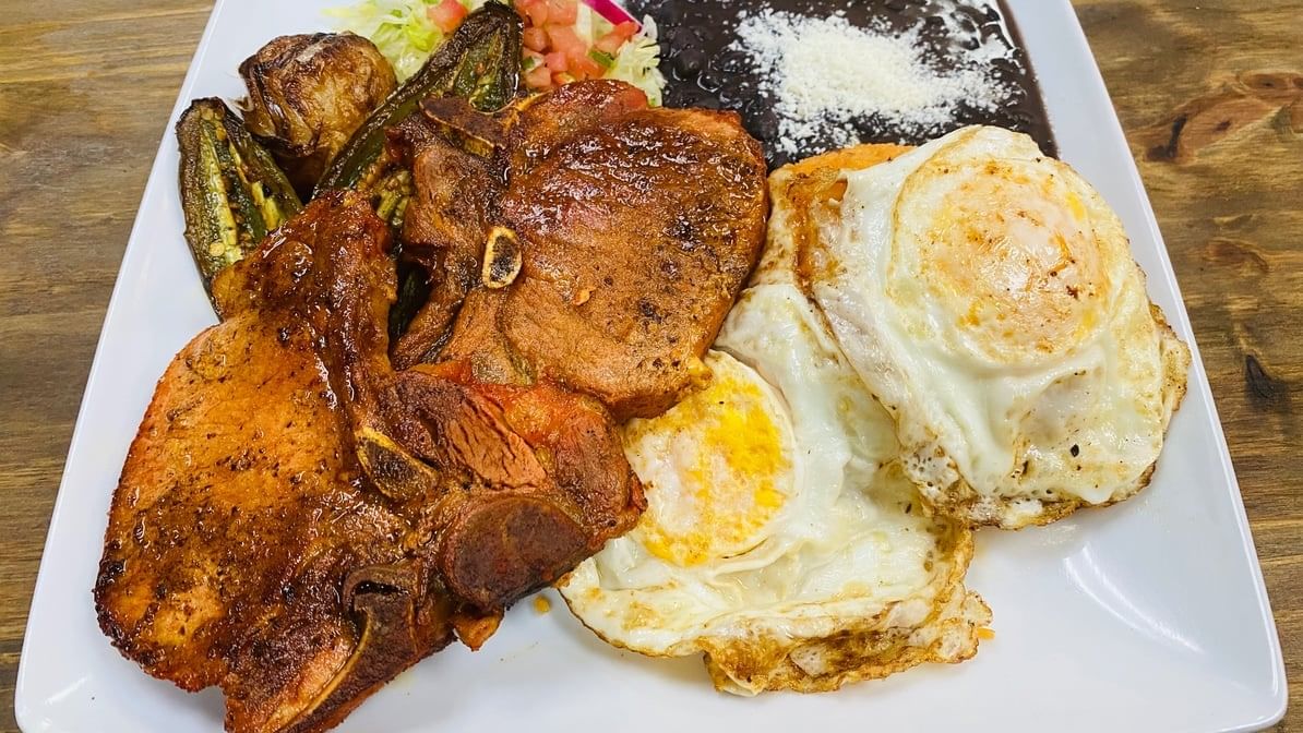 2pcs grilled pork chop with choice of preparation. Served with salad, tortillas, rice & beans.