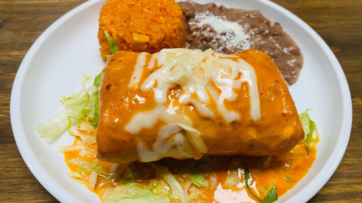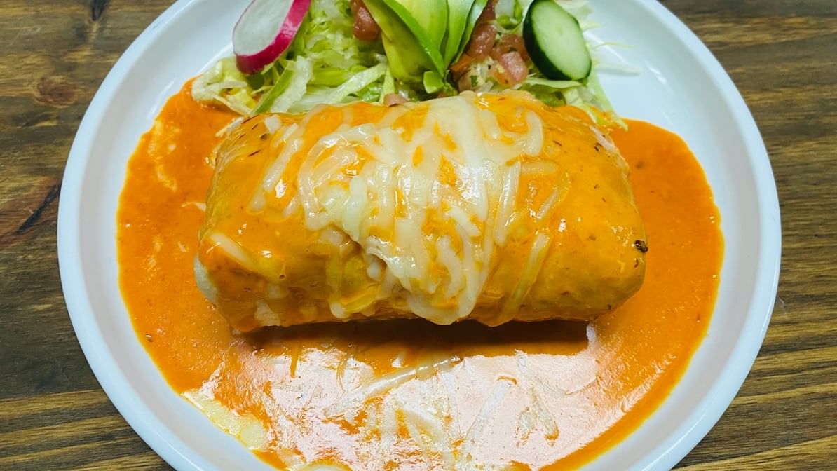 One large flour tortilla stuffed with chicken, asada, shrimp, rice, beans, and Monterey Jack cheese. Topped with ranchera salsa & melted cheese, and all burritos served with salad, rice, or fries.