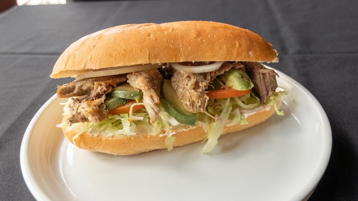Juicy shredded pork shoulder. Comes with refried beans, mayo, lettuce, onions, tomatoes, queso fresco, avocado & chipotle. Served with fries.