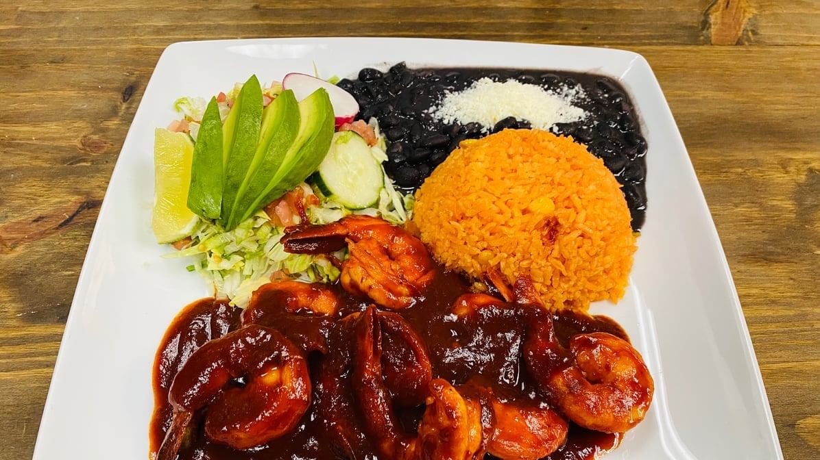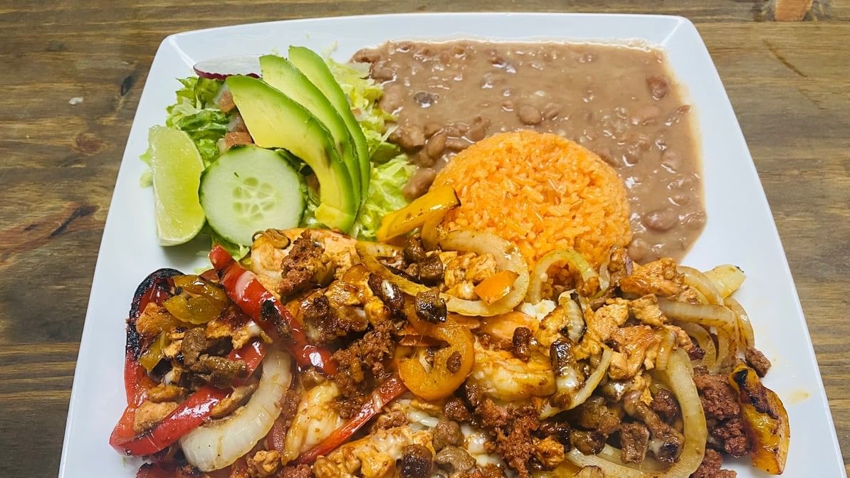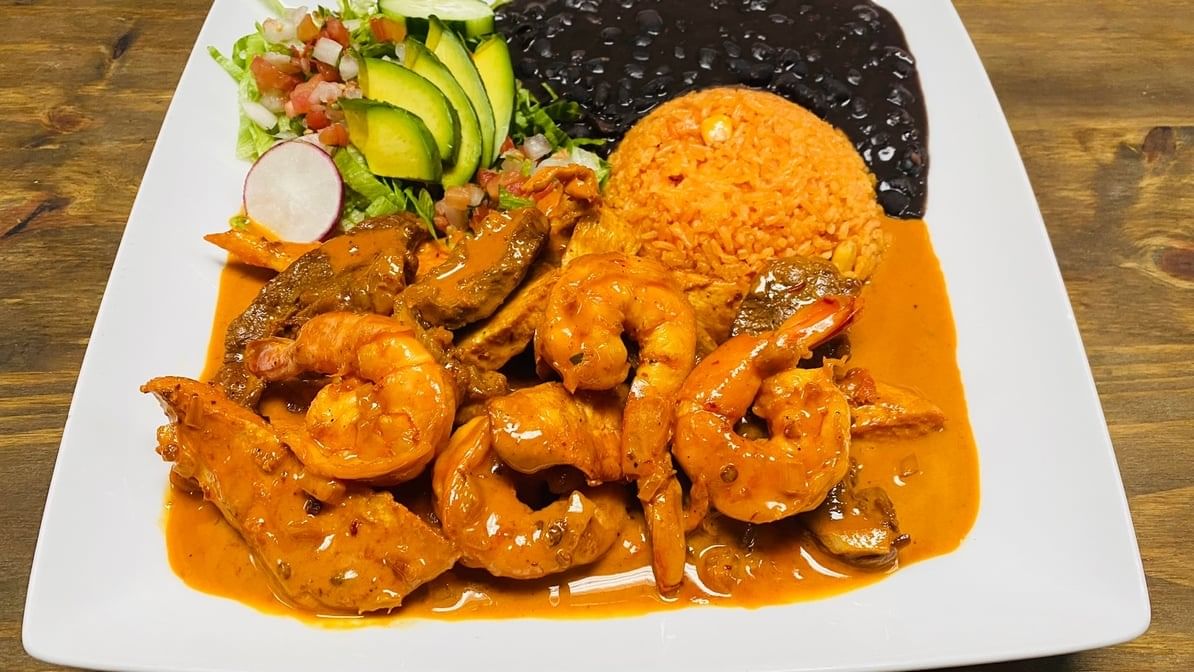 Pan-roasted chicken, shrimp & steak. Cooked in the arbol sauce (mild spicy). Served with salad, rice & beans.