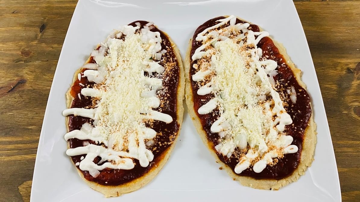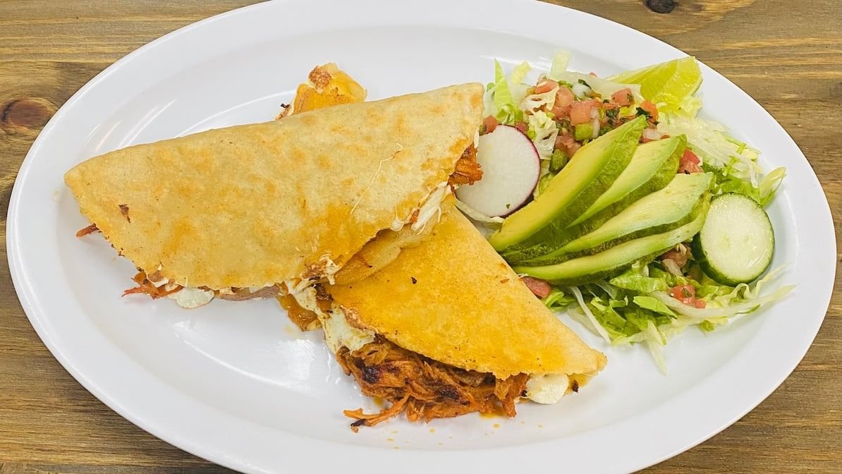 One 16” Oaxaca traditional crunchy tortilla. Topped w/ black beans, cabbage, avocado, onions, Oaxaca cheese, tomatoes, sour cream & cotija. Choose your meat. A traditional dish from Oaxaca.