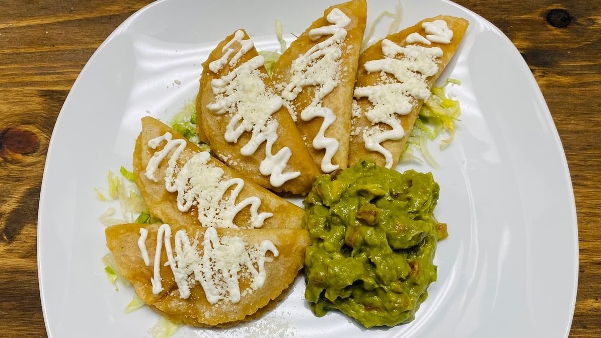 3 pcs homemade corn empanadas, choice of stuffed picadillo, chicken & potatoes, chori-papa, or pescado on lettuce. Topped w/ sour cream, cotija & Pico