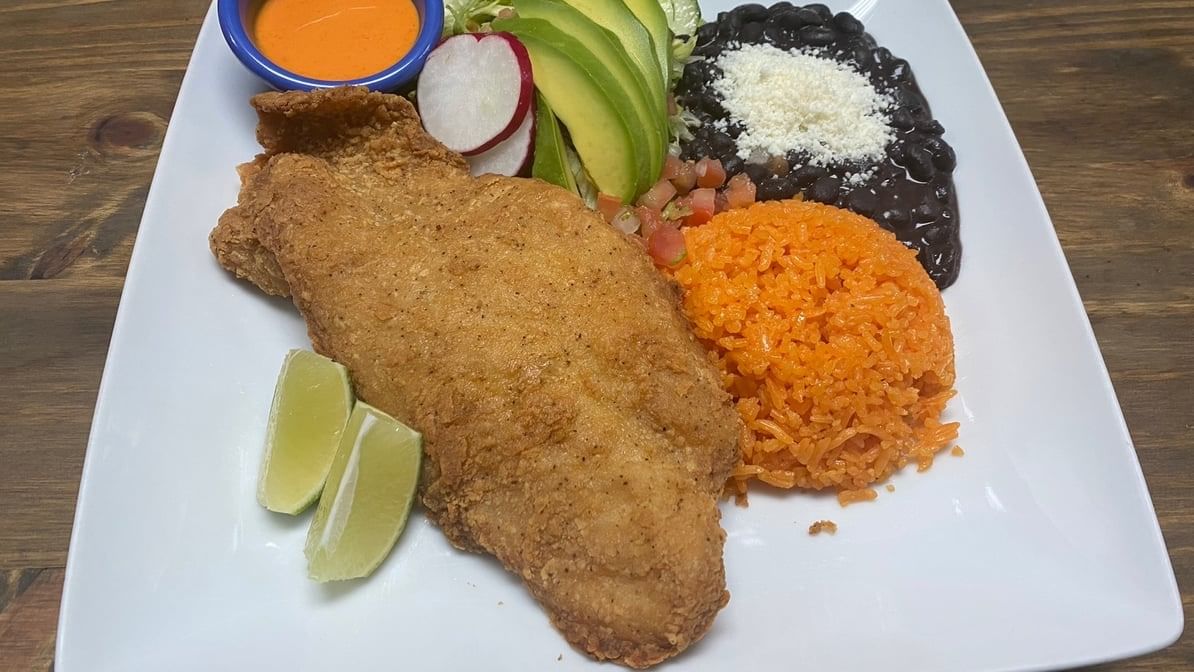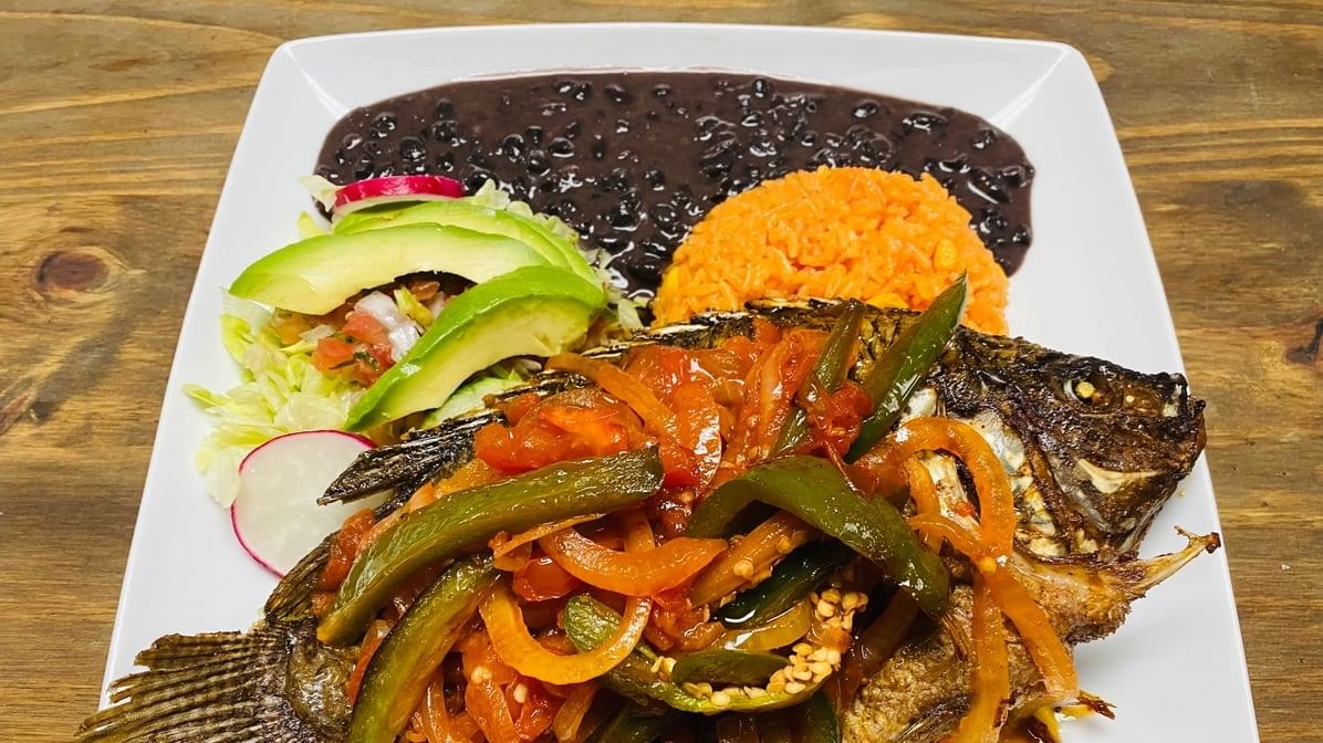 Fried whole tilapia. Choose your style. Served with salad, rice & beans.