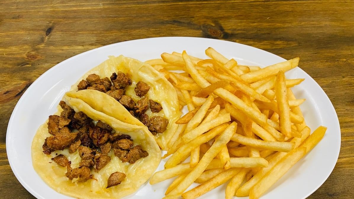 Choice of chicken, ground beef, or steak. 2pcs. crispy tortilla with Monterey cheese. Topped with sour cream & cotija. Served with rice or French fries.