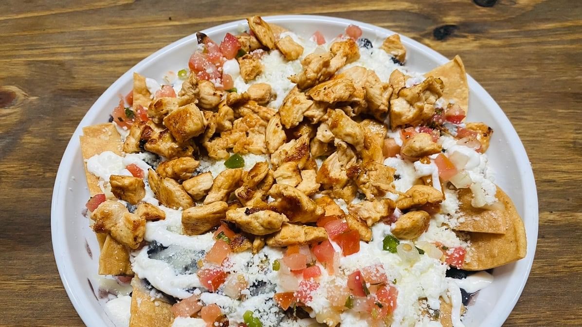(Tinga, asada, al pastor, chicken, chorizo or ground beef) Fresh corn tortillas chips topped with black beans, Monterey jack cheese, choice of meat, sour cream, cotija cheese, Pico de Gallo & guacamole