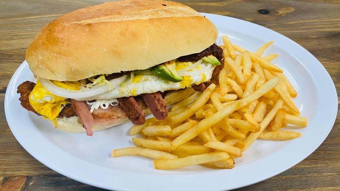 Bacon, ham, pineapple, chicken Milanese, ketchup, and honey mustard. Comes with refried beans, mayo, lettuce, onions, tomatoes, queso fresco, avocado & chipotle. Served with fries.