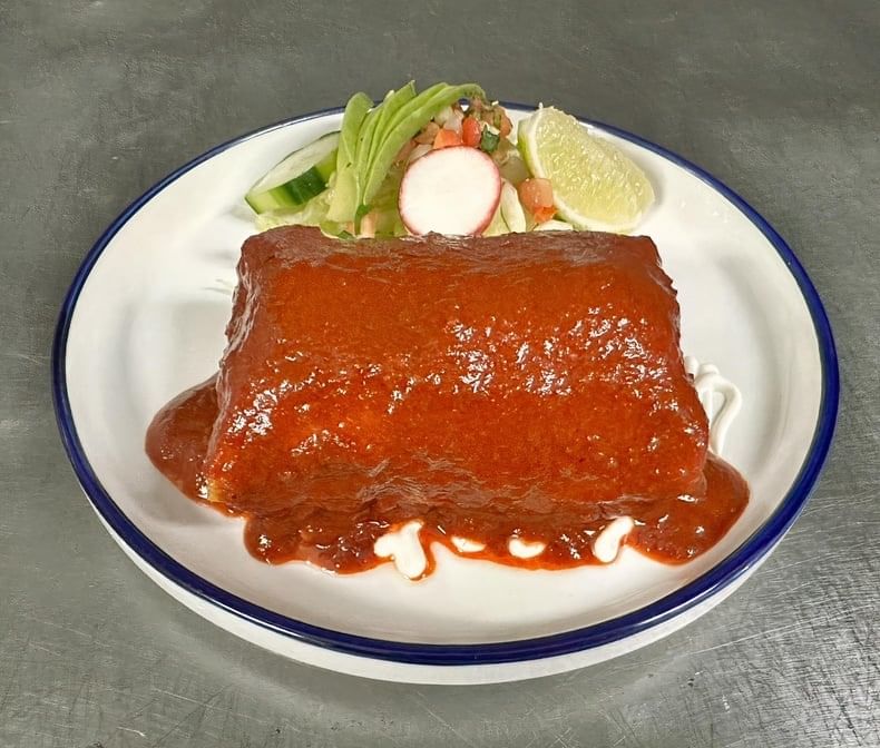 One fried flour tortilla stuffed with chorizo, asada, chicken, peppers,, and cheese, on mild creamy arbol chili sauce. Topped with melted cheese & Pico de Gallo. Served with rice and beans.