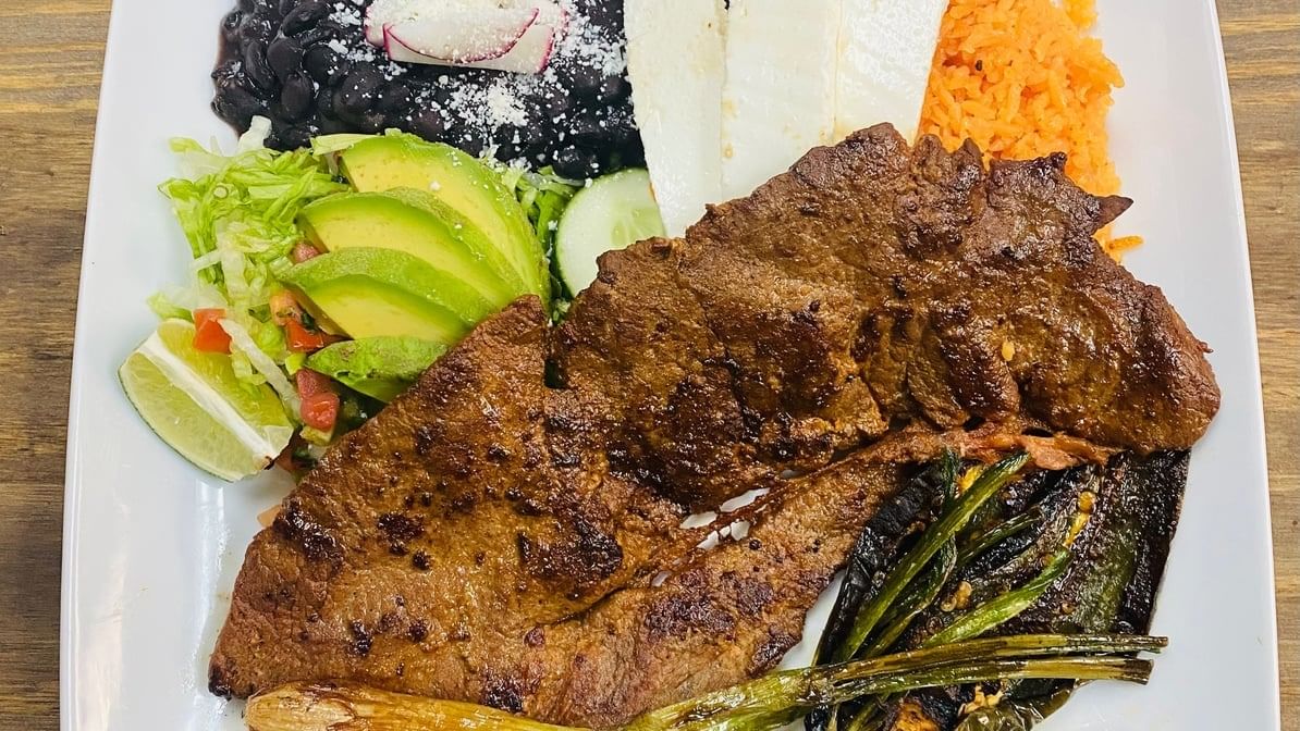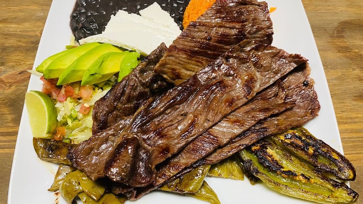 Grilled skirt steak, jalapeño & nopal. Served with salad, rice & beans