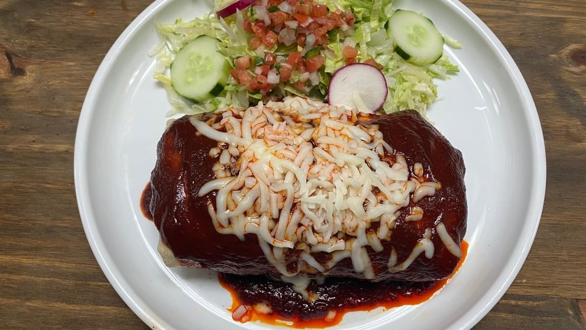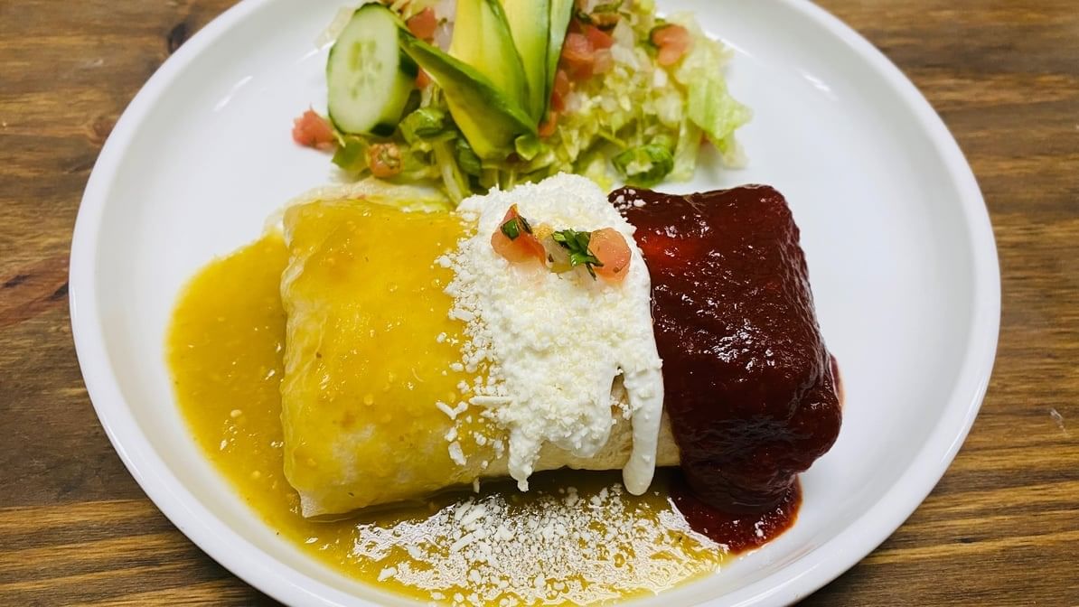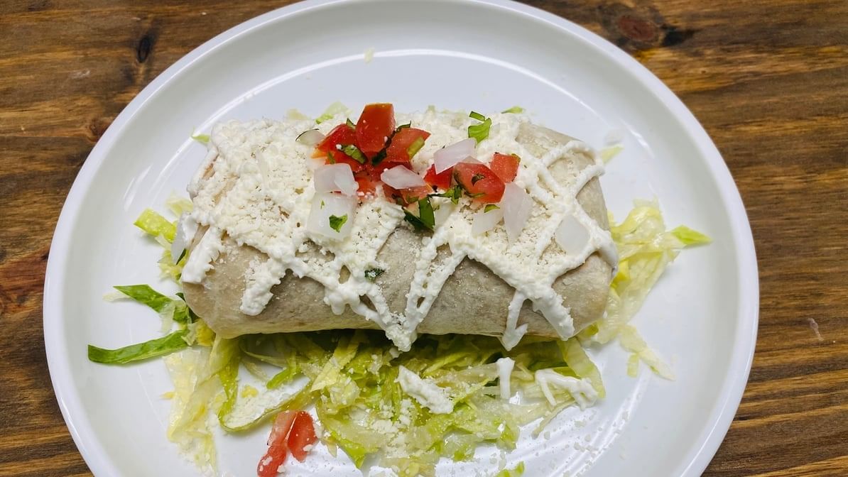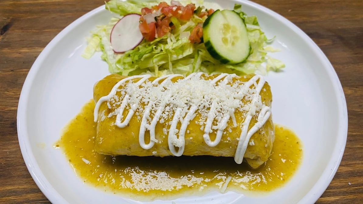 One large flour tortilla stuffed with asada (steak), rice, beans, Monterey Jack cheese, topped with green & ranchera salsa, sour cream & cotija cheese.