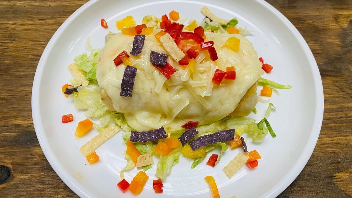 Large flour tortilla stuffed with chicken or steak, rice, beans, sour cream, Monterrey Cheese, & guacamole on lettuce. Topped with melted cheese, colorful pepper & colorful tortilla chips.