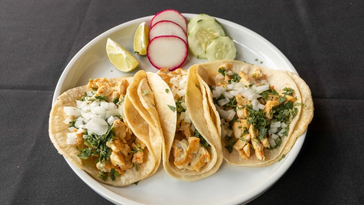 Grilled chicken. 3 tacos per order; topped with cilantro & onions.