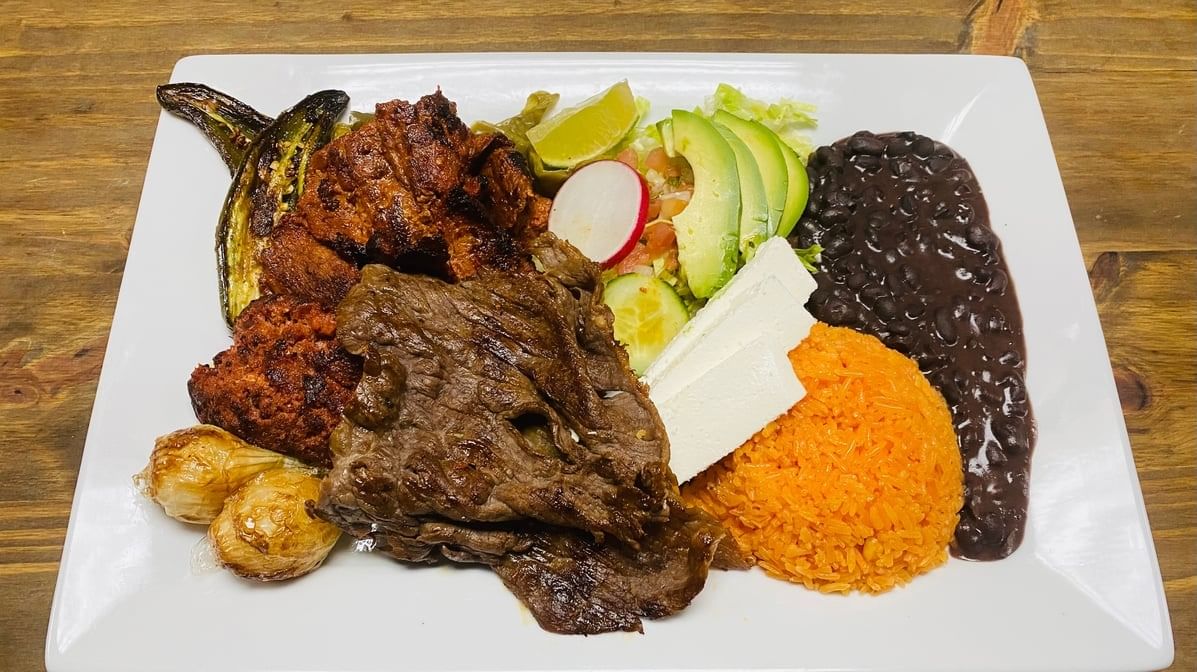 Salted beef, Mexican sausage, spicy marinated pork, cactus Salad, cambray onions, jalapeño & guacamole. Served with salad, tortillas, rice & beans.