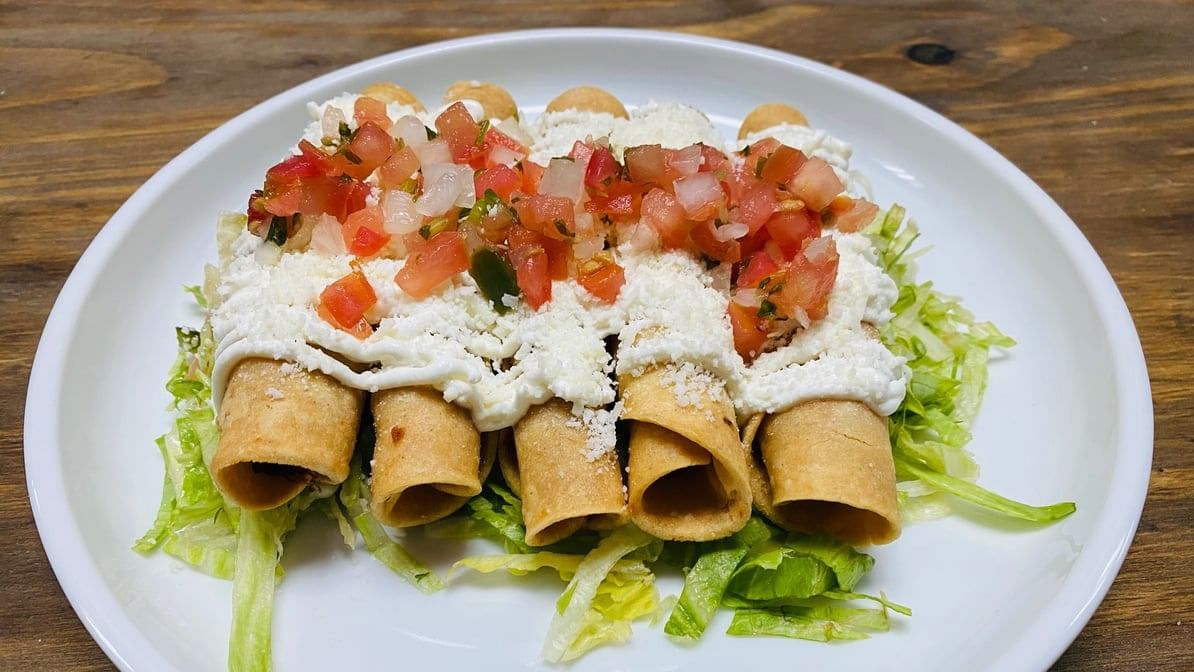 3pcs. rolled corn tortilla stuffed w/ shrimp. Topped with bandera salsa, sour cream & cotija. Served with rice & beans