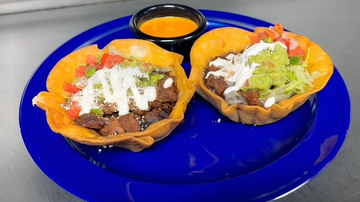Two mini crispy flour tortilla shells filled with beans, lettuce, ground beef, Monterey cheese, Pico de Gallo & guacamole. Served with agave chipotle sauce