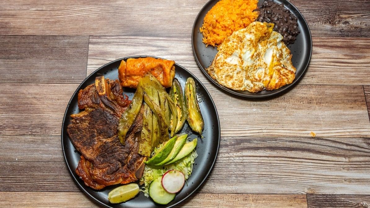 Porterhouse-steak, two eggs, nopales, cambray onions, & grilled jalapeno. Choice of a shrimp mini burrito or mini chimichanga. Served with salad, tortillas, rice & beans.