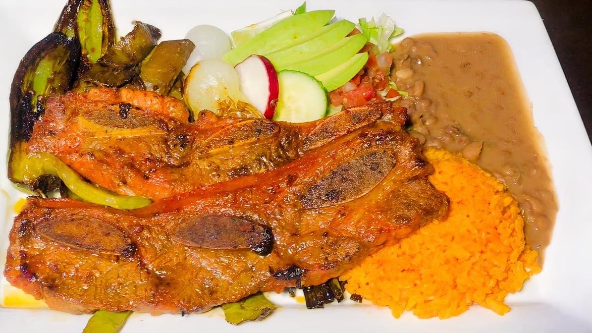 Grilled angus beef short ribs, Jalapeño, cambray onions, and cactus. Served with salad, rice, & beans