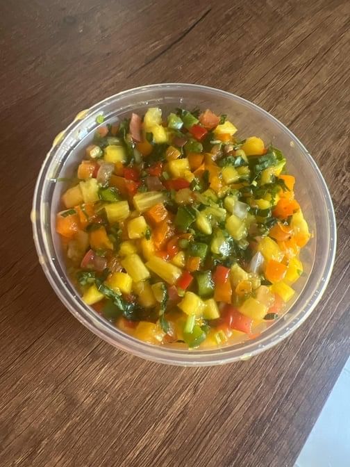 Pan roasted fresh juicy salmon. Topped with fresh mango pineapple salsa. Served with rice & vegetables