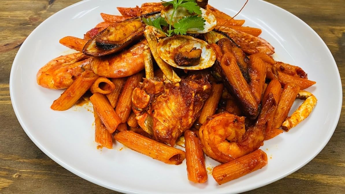 Pan roasted mixed seafood (clams, shrimps, mussels, calamari, crab, & pasta) cooked in diabla salsa