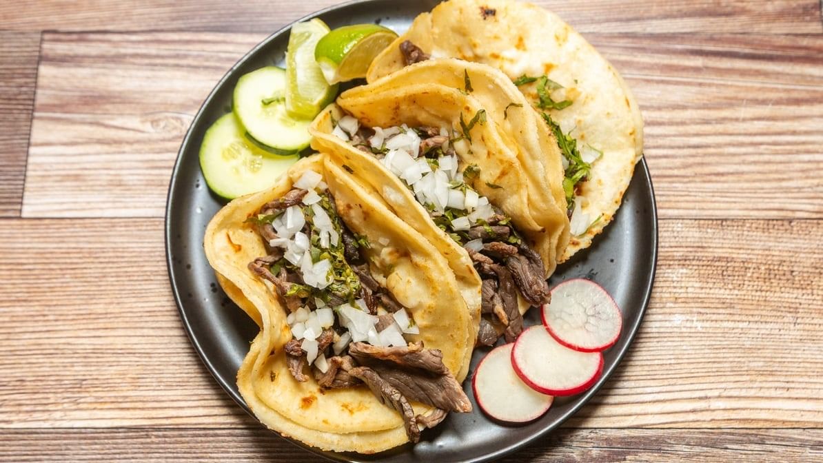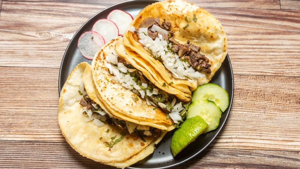 Traditional beef cooked & 18 marinated w/ Mexican spices. Tripe (beef tripe). 3 tacos per order; topped with cilantro & onions.