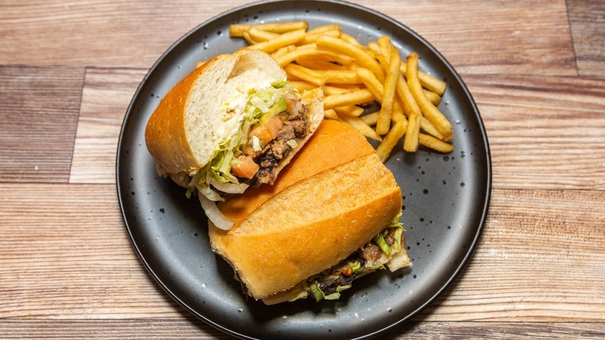 Grilled beef. Comes with refried beans, mayo, lettuce, onions, tomatoes, queso fresco, avocado & chipotle. Served with fries.