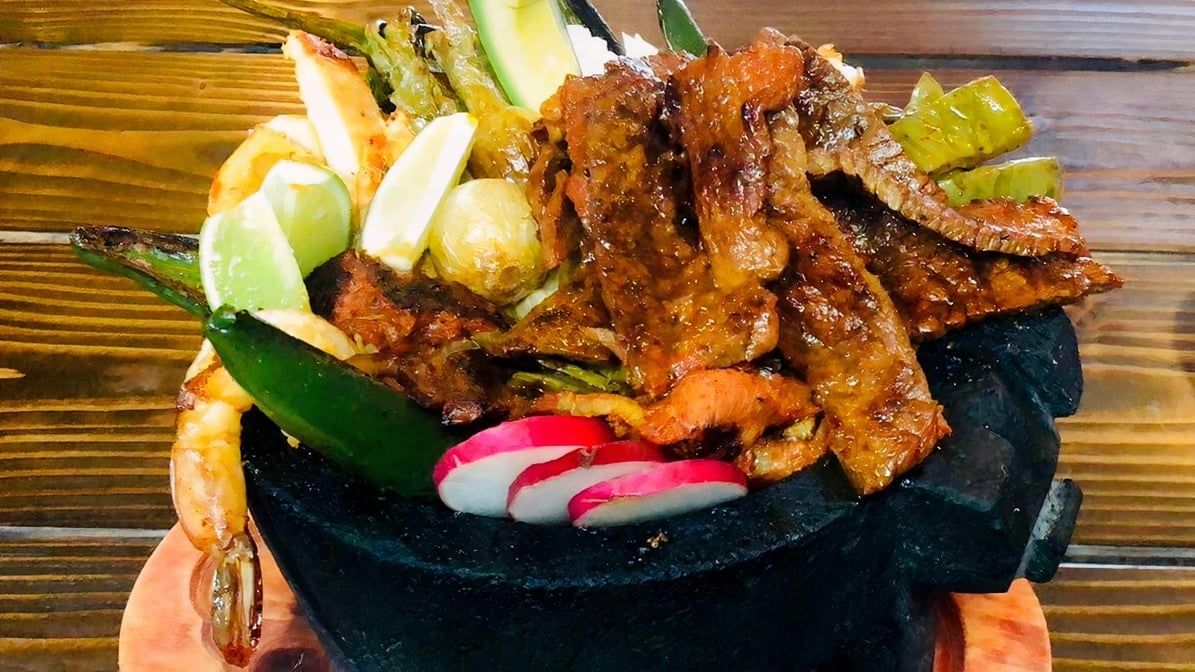 A mix of meats served in a traditional volcanic stone molcajete. Homemade grilled marinated pork, salchicha, chicken, angus beef short ribs, shrimp, cactus, cambray onions, queso fresco & avocado.