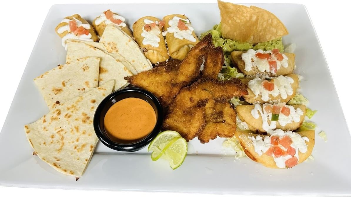 One mini asada quesadilla, 4 pcs. chicken & potato, mini empanadas bites, guacamole, 4 pcs fried shrimps & 4 pcs cheese mini chimichangas bites