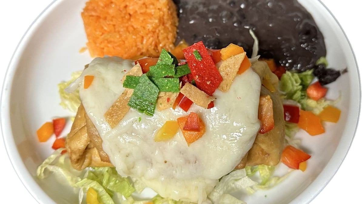One deep-fried large flour tortilla stuffed with chicken, shrimp, asada, and Monterey cheese. Topped with ranchera salsa & melted cheese. Served with rice and beans.