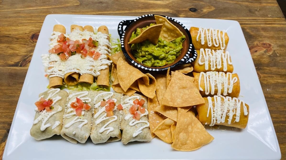 Guacamole, tortilla chips, 4 pieces chicken & potatoes mini flautas, 4 cheese mini burritos bites & 4 cheese mini chimichangas bites