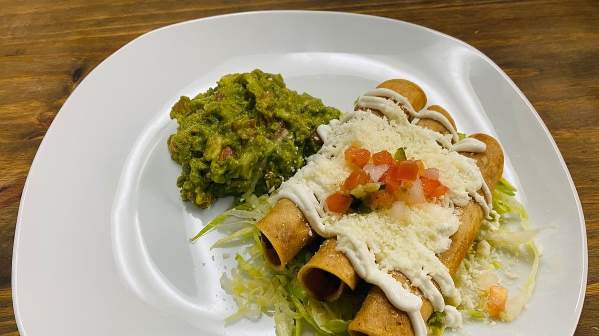 3 pieces chicken with potatoes mini flautas topped with sour cream cotija cheese, & Pico de Gallo. Served with guacamole