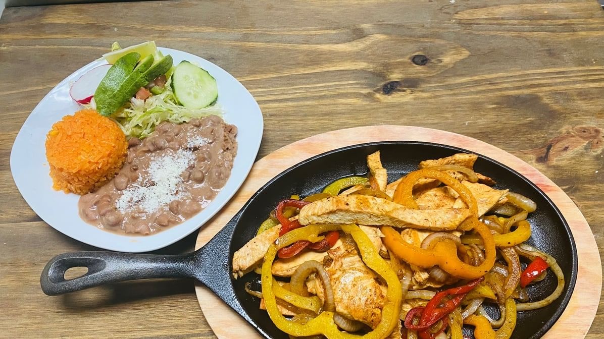 Pan roasted onions, colorful peppers, and a choice of meat (chicken, steak, chorizo, or veggies) on a hot skillet. Served with salad, tortillas, rice & beans.