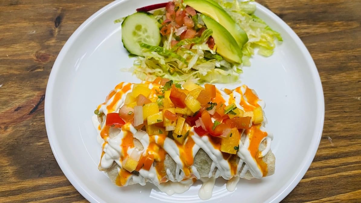 One deep-fried large flour tortilla stuffed with al pastor, Monterey cheese, and green avocado salsa topped with melted cheese, sour cream & pineapple. Served with rice and beans.