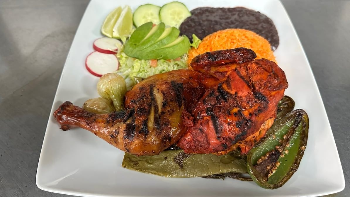 1/2 grilled loco chicken w/ grilled cactus & jalapeño. Served. w rice, beans, salad & Pico de Gallo.