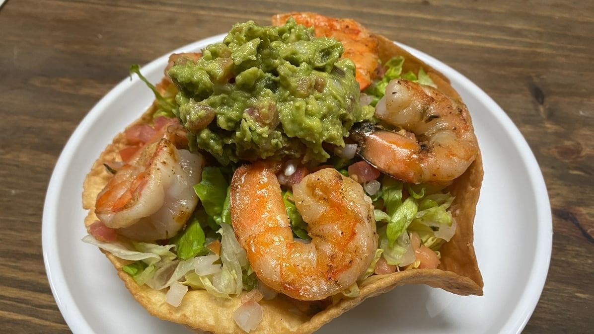 A crispy flour tortilla shell filled with lettuce. Topped. with pico de gallo, guacamole & choice of meat.
